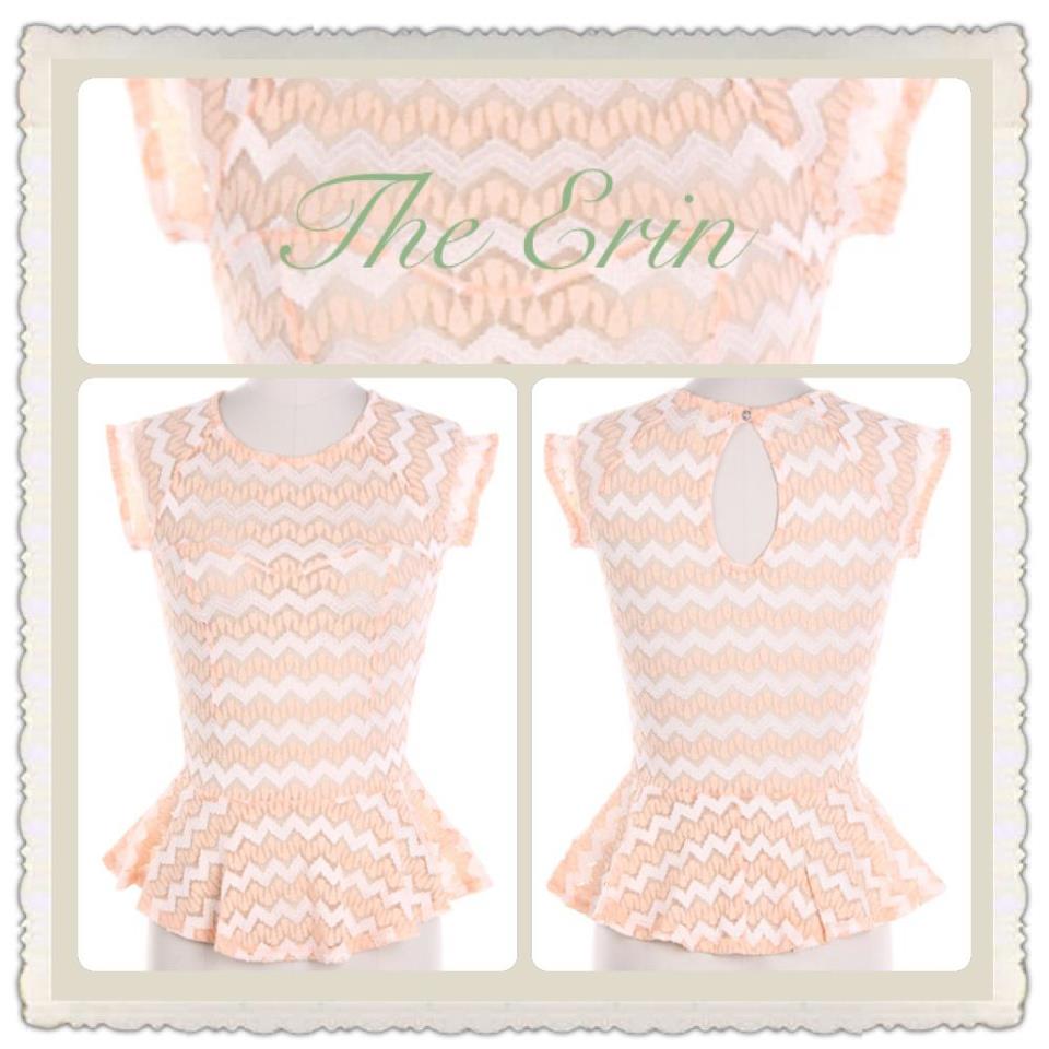 The Erin is a dashing lace peplum top featuring peach chevron and an elegant keyhole back. Grace your next wedding shower in this piece paired with mint skinny pants or a white pencil skirt and nude heels.
