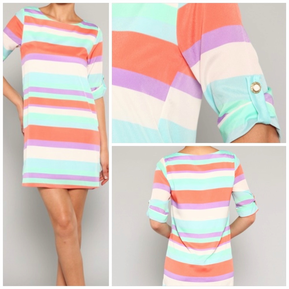 The Jessica is a lively, yet elegant quarter-sleeve shift dress striped with vibrant colors that will make you stand out in a crowd. Pair with nude heels and a skinny belt to make a splash at your Cinco de Mayo celebration.