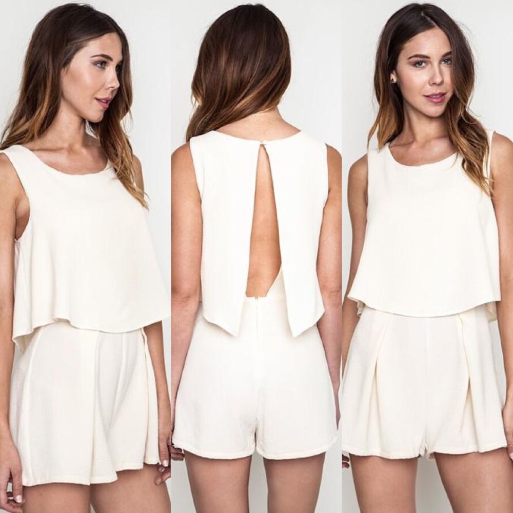 The Kendall - a flirty white romper that is the perfect transition in between summer and fall featuring a delicate open back with a flowy short. A great piece to pair with a maroon cardigan and booties for the fall. This is a no brainier for brides-to-be.