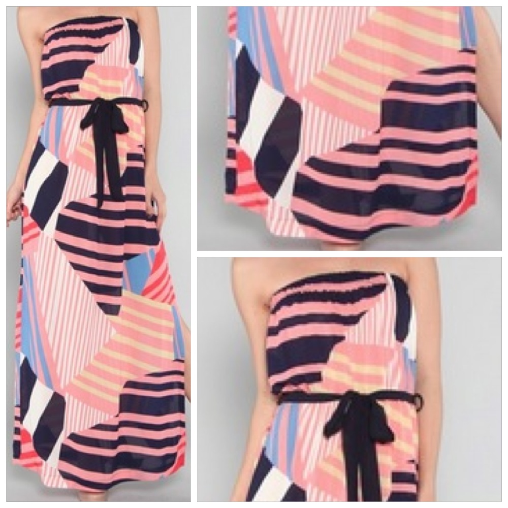 The "Katie" is a chiffon maxi-dress featuring trending bold stripes in navy, pink and yellow with a navy chiffon belt to tie it altogether. Own the sandy beaches of spring break or summer vacay in this maxi with wedges and a pair of shades.