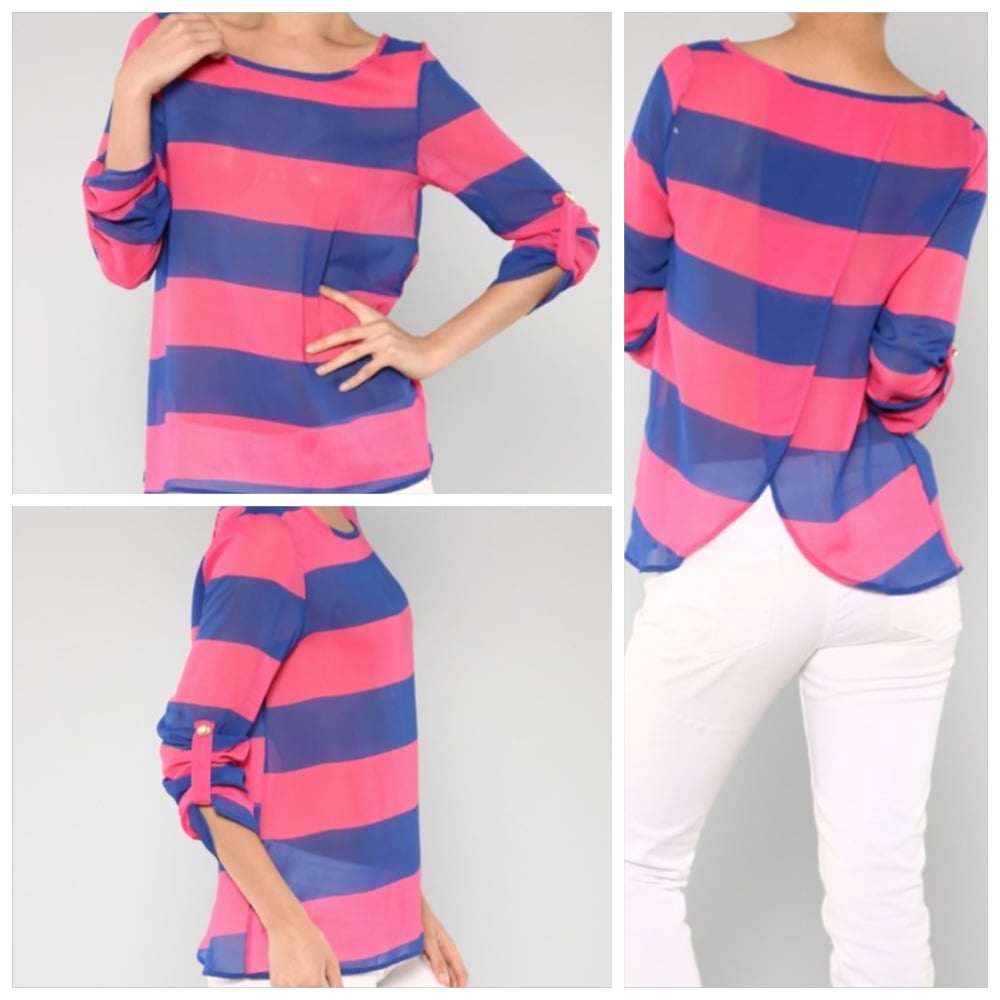 The Haley is an inviting 3/4 sleeve, chiffon blouse in magenta and blue that is elegantly detailed with gold buttons on each sleeve and split down the back giving it a light and breezy feel. Pair this with your favorite drop necklace, white skinnies and pumps for you next night out.