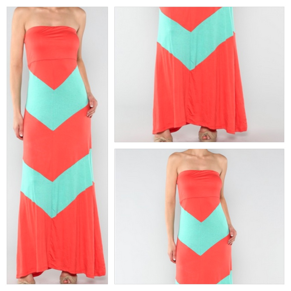 We have been waiting to get our hands on the next Biscotti piece for awhile now and very pleased to share with you The Savannah - a strapless floor-length maxi-dress in coral featuring thick, mint chevron stripes that make for a vibrant color contrast. This dress is just begging for a mint statement necklace to complete your look!